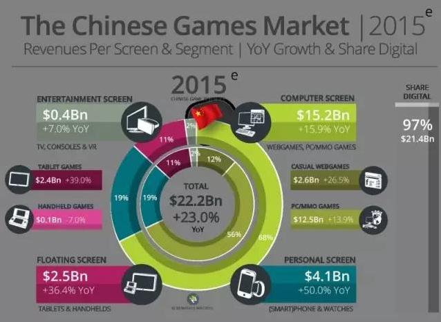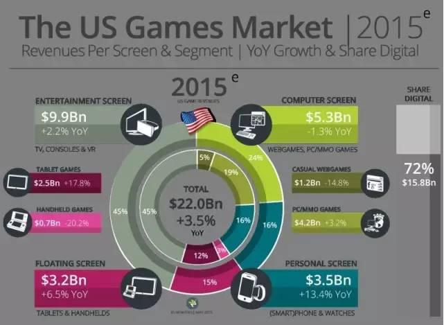 游戏内容上,E3展更偏向单机、主机一些,而ChinaJoy更偏向网游、PC和手游。这也符合之前NewZoo对全球游戏市场的统计:中国游戏市场总值 约220亿美元,其中PC游戏市场占152亿美元,手游和掌机分别占41亿美元和25亿美元,主机游戏只占4亿美元份额。而美国游戏市场总值约220亿美 元,其中PC游戏市场占53亿美元,手游和掌机分别占35亿美元和32亿美元,而主机游戏市场则占据99亿美元的份额。可以看出,手游和掌机的游戏市场份 额,中美几乎一致,但美国的PC和主机游戏市场相对平均,而中国几乎没有多少主机游戏市场的份额,全部聚集在PC游戏上。