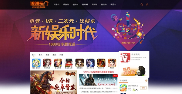 凑巧的是,1688玩新版官网的上线节点也恰逢2016ChinaJoy的举办期,新版官网的CJ专题页辨识度更高更加醒目,交互界面更加人性化,设计风格更加时尚扁平,各类板块更加齐全专业,相信在将来为厂商提供更突出的展示推广,为玩家提供更好的体验和服务。