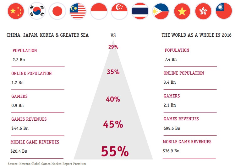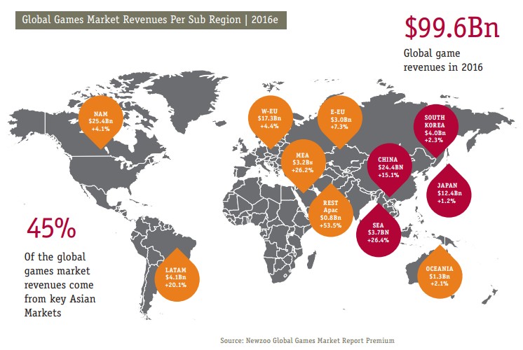 根据NewZoo最新发布的亚洲市场报告中提到,2016年全球游戏市场规模将达到996亿美元,其中亚洲中主要市场日本、韩国、中国以及东南亚国家的份额比例占全球市场的45%,即将近450亿美元。