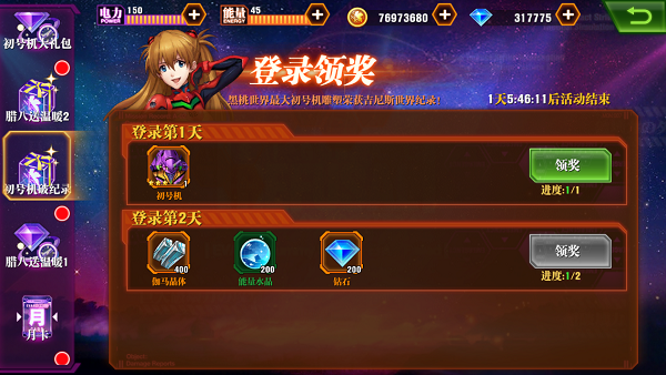 全服欢乐庆新年,福利多多享不停!1月3日-1月4日,全服只要登入游戏,第一天就得霸气初号机,第二日更有大量钻石,能量水晶,伽马晶体等你拿。助力玩家打造最强初号机体。同时,想要更快获得吊炸天的初号机,玩家还可参与充值活动,只需投入一点点便可携初号机大礼包回家,开开心心过新年。