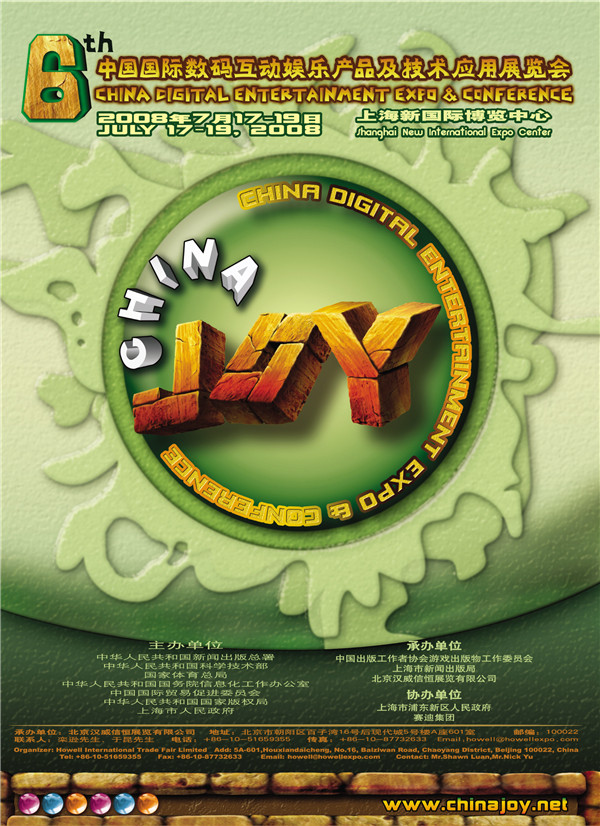 第六届ChinaJoy于2008年北京奥运会前夕举行,全国上下当时正沉浸在承办奥运会的喜悦激动氛围中,本届ChinaJoy也将主题定为“弘扬奥运精神,再创产业辉煌”。本届ChinaJoy特别加强了“BTOB商务洽谈区”的展示功能,许多国内外知名厂商当年的新作和合作项目都在这里有所发布。本届展会吸引了169家企业参展,11万人次观众观展,值得一提的是,国内展品在数量上首次超越国外,再次证明了中国游戏产业的崛起趋势。这届ChinaJoy在海报设计上参考了当时非常火爆的休闲类游戏——祖玛的游戏界面,并将健康环保的绿色作为主打色调,十分切合当时的“绿色奥运”理念。