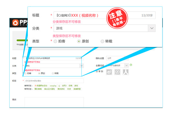 第二步:参赛用户上传视频时,请务必在标题处注明【CJ剑网3】的前缀标题,并且分类及类型请选择“游戏”及“原创”选项。游戏标签可按视频特色进行填选。