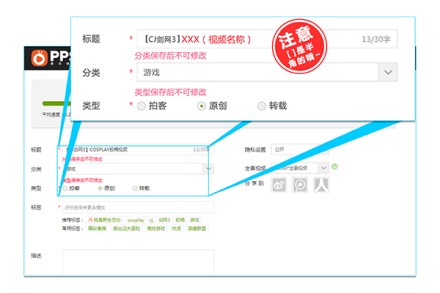 第二步:参赛用户上传视频时,请务必在标题处注明【CJ剑网3】的前缀标题,并且分类及类型请选择“游戏”及“原创”选项。游戏标签可按视频特色进行填选。