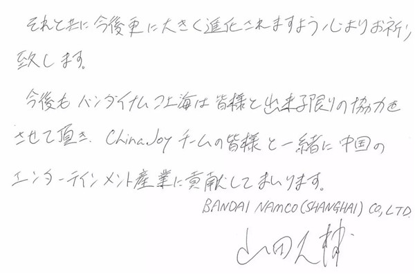 在此,ChinaJoy主办方汉威信恒非常感谢山田大辅先生对ChinaJoy展会的衷心祝贺,并由衷感谢万代南梦宫多年以来对ChinaJoy的大力支持!