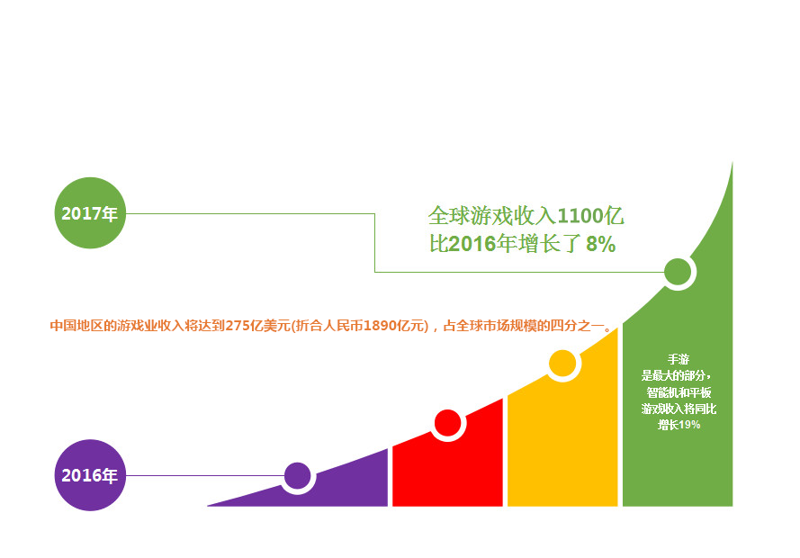 同时,根据2016年收入数据,《中国游企版图》预计2017年全球游戏业收入规模有望达到1100亿美元,同比2016年增长8%,其中数字游戏收入944亿美元,占全球市场总规模的87%。手游是最大的部分,智能机和平板游戏收入将同比增长19%至461亿美元,占市场总收入的42%。中国地区的游戏业收入将达到275亿美元(折合人民币1890亿元),占全球市场规模的四分之一。由此可见,在全球经济不景气的大环境下,中国游戏市场虽然连续三年增速放缓,但在全球游戏市场的份额愈发扩大。