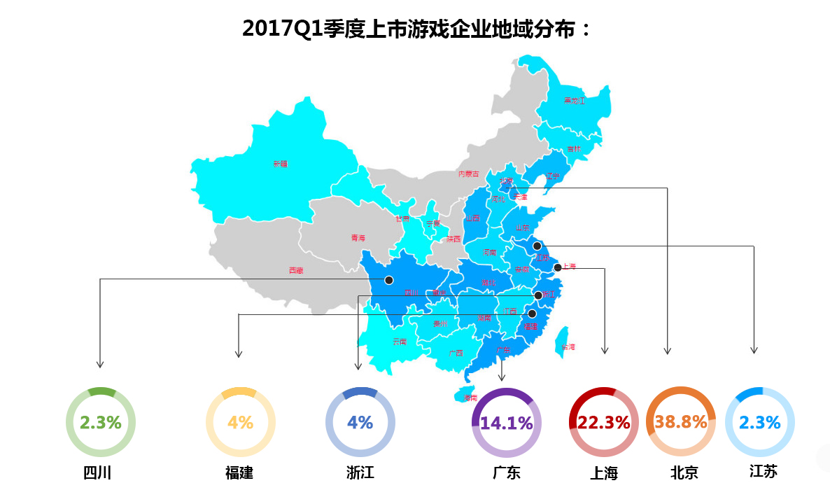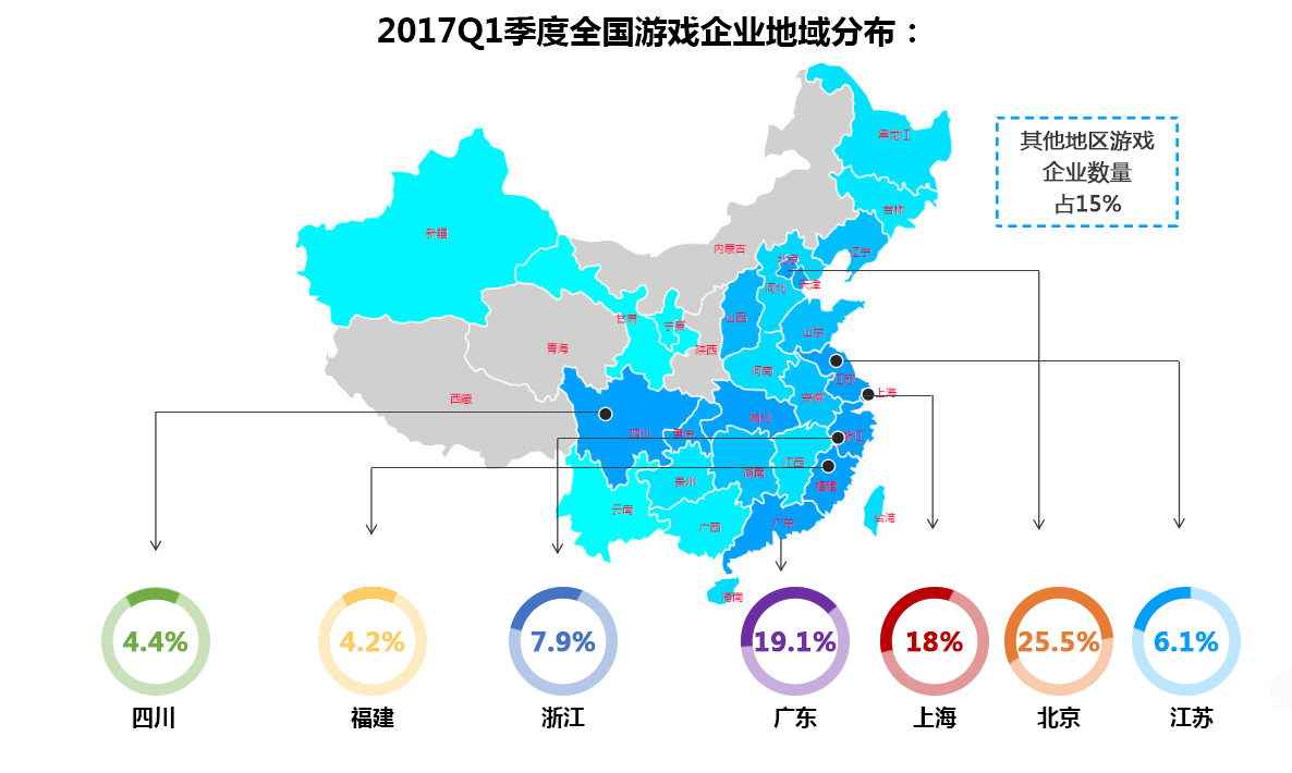 2017年Q1季度,在《中国游企版图》已收录的1926家游戏企业中,北京游戏企业占25.5%(上市游戏企业占38.8%),上海游戏企业占18%(上市游戏企业占22.3%),广东游戏企业占19.1%(上市游戏企业占14.1%),浙江游戏企业占7.9%(上市游戏企业占4%),江苏游戏企业占6.1%(上市游戏企业占2.3%),福建游戏企业4.2%(上市游戏企业占4%),四川游戏企业占4.4%(上市游戏企业占2.3%),其他地区游戏企业占14.8%(其他地区上市游戏企业占12.2%)。