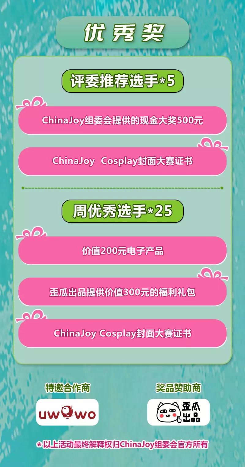2018ChinaJoy Cosplay封面大赛进行中!!个人赛、团体赛、静态电影、微电影、微博人气、优秀摄影师、优秀后期师、评委推荐、周优秀选手,二十一项大奖将会花落谁家?各种豪礼大奖等你来拿,快来投稿吧!