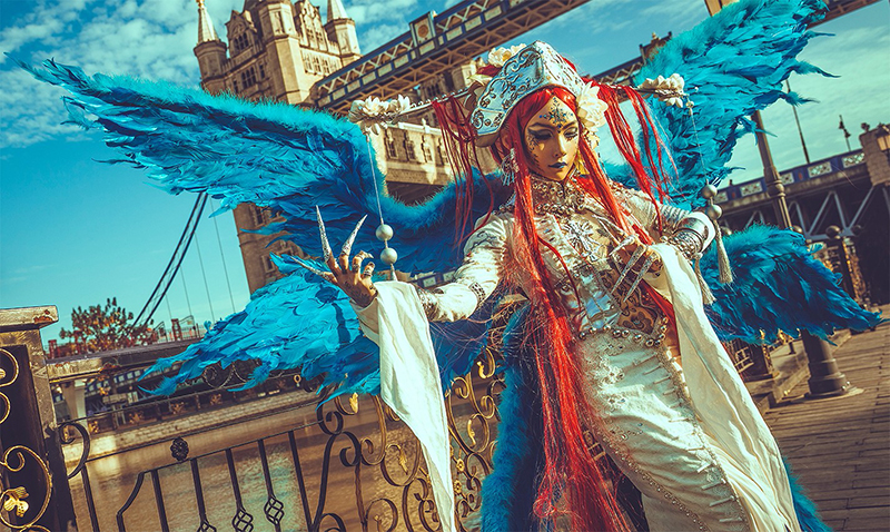 这组片子可以说已经超出了普通的cosplay作品,从视觉效果上直逼时尚大片!华丽而诡谲的角色扮相与古老的伦敦桥十分契合,极具美感与视觉冲击,令人拍案叫绝。