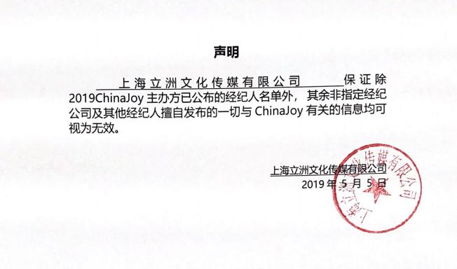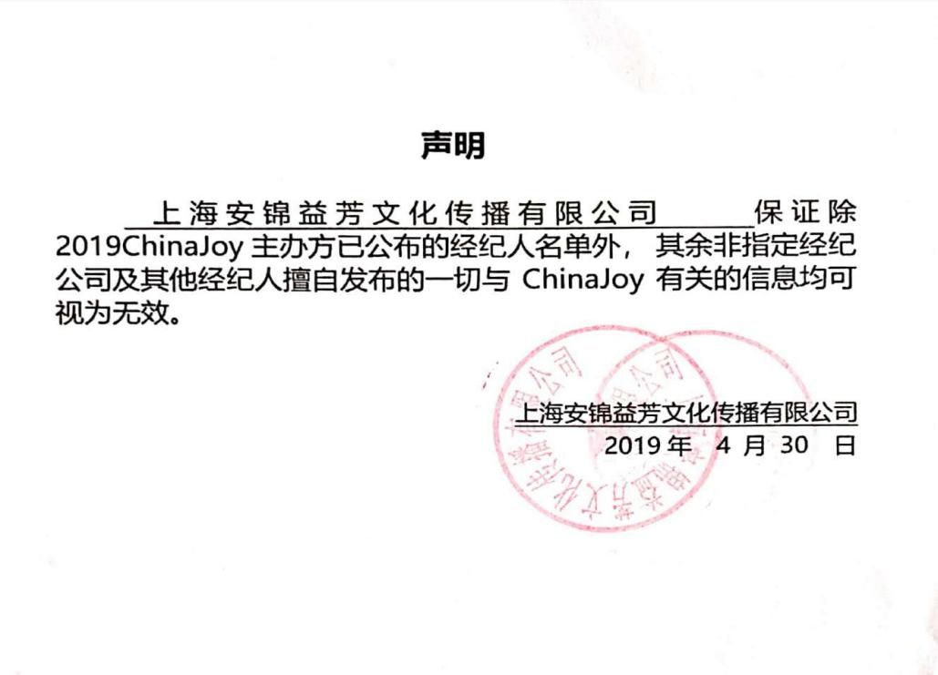 2019ChinaJoy指定经纪公司声明(排名不分先后)
