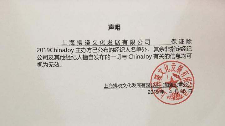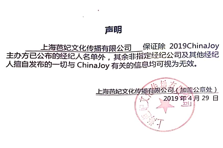 2019ChinaJoy指定经纪公司声明及经纪人名单公布