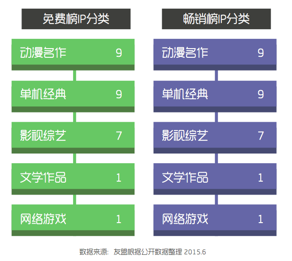 友盟在今年7月的《2015中国移动游戏白皮书》中显示,以iOS游戏为例,免费榜中有IP的游戏占18%,畅销榜中有IP的游戏占25%,其中动漫作品IP最受追捧。