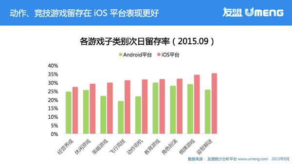 2015年,策略、角色扮演类等玩法偏重的游戏启动更加频繁,这些类别的活跃玩家单日启动次数超过6次。友盟分析主要原因是,一方面游戏开发商利用产品设计,比如炫酷的画面、关卡、特效等来提升玩家的黏性;另一方面,对于动作、竞技和策略游戏来说,iOS的设备流畅体验使得玩家更倾向频繁回访。
