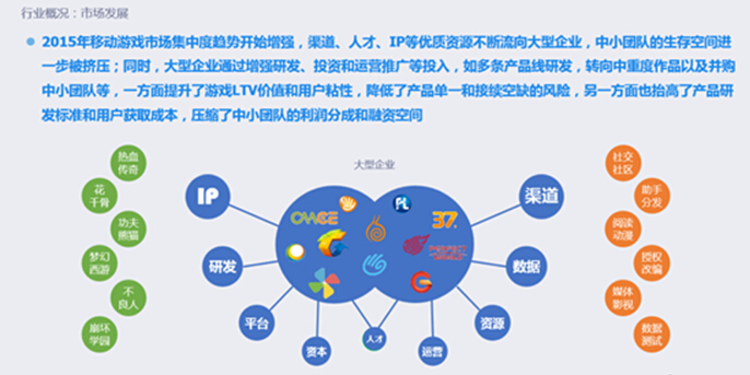 2015年移动游戏市场集中度趋势开始增强,渠道、人才、IP等优质资源不断流向大型企业,中小团队的生存空间进一步被挤压;同时,大型企业通过增强研发、投资和运营推广等投入,如多条产品线研发,转向中重度作品以及并购中小团队等,一方面提升了游戏LTV价值和用户粘性,降低了产品单一和接续空缺的风险,另一方面也抬高了产品研发标准和用户获取成本,压缩了中小团队的利润分成和融资空间。