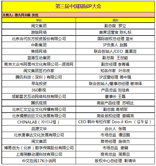 IP大会同样邀请众多国内一线娱乐企业高管前来助阵。来自阅文集团、游族网络、当代东方投资公司、中影集团、焦扬网络等企业代表将登台演讲。