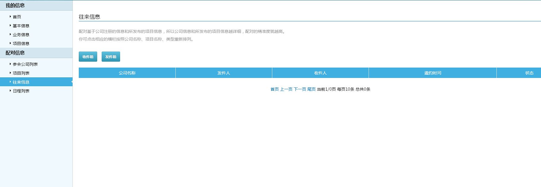 3往来信息——点击左侧“往来信息”,可浏览“收件箱”、“发件箱”、“草稿箱”,查看邀请是否通过;