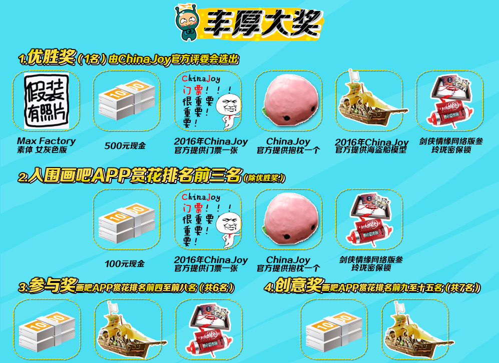 本次由ChinaJoy主办,画吧APP承办的有奖征集活动时间为2016年5月23日至6月23日,不管是喜爱绘画的小伙伴,还是拥有“神之手”的原创大神,赶快参加我们的征集活动吧,奖品非常丰厚!同时最终入选的作品有可能在现实中空降ChinaJoy展会现场哟,让我们一起来期待吧~