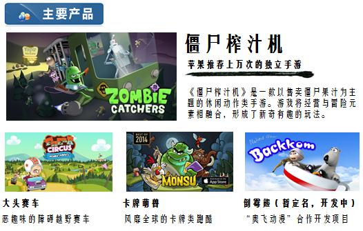公司目前主打手游为僵尸榨汁机,今年已连续5次获得中国区苹果推荐。