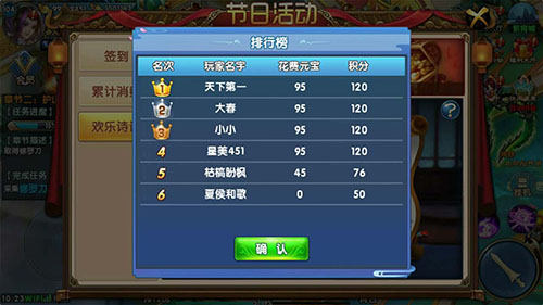 玩家在“欢乐诗词”活动中,每天都会有若干次的免费次数进行游戏,五言和七言是公用免费次数的,如果每天不把次数用完那实在是太浪费啦~还有哦,在五言和七言的答题中获得的积分可以将玩家推上排行榜的!所以,诸位仙友的大好才华何不在“欢乐诗词”中好好体现呢?名利双收,岂不快哉!