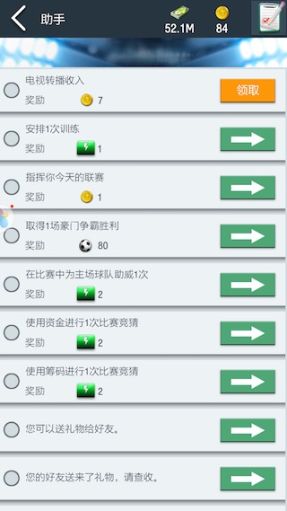 《梦幻足球经理》是一款以助力玩家圆上一个足球梦为愿景的游戏,在游戏中价值极为贵重的金币,普通玩家通过日常任务就可以轻松获取。目前获得金币的任务有两种,一种是指挥今天的比赛,一种是电视转播收入。也因此,对于每个经理来说,每日的比赛指挥就极其重要,既可以锻炼指挥能力提高比赛胜率,又可以有稳定的金币收入,一举双得十分给力;另外,玩家如果现实中事务繁忙不得不放下游戏一段时间,当再次登录时还会获得电视转播收入的金币补偿,这对休闲玩家来说也是极为丰厚的福利。
