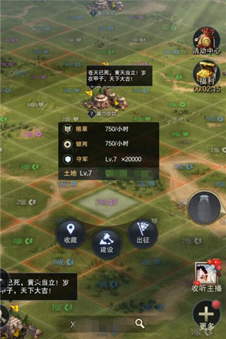 游戏中,宫城的等级限制着土地的数量与范围,在有限的数量与范围内,各位主公们需要尽力占领高级土地,如在一级资源带的时候,尽量多打3级以上的土地,最好能打4级以及5级土地,打了5级土地,间隔一段时间还会长出村庄,主公们派兵占领村庄可以额外获得更丰厚的收益!