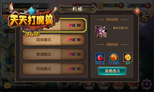 优戏网《天天打魔兽》中,玩家挑战机械BOSS,可根据挑战难度的不同,获取坦克之血、狂野之血、力之觉醒石、金币等多种道具奖励!