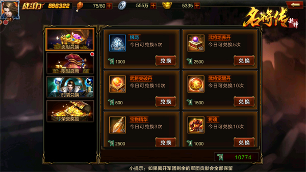 除了上面这些方式外,玩家还有一个获取将魂的方法,那就是去军团货商处兑换。玩家每天为军团做出贡献,会获得相应数量的军团贡献,玩家可利用这些贡献来进行兑换,比如可以用1000的军团贡献兑换100个将魂,每天有十次机会。