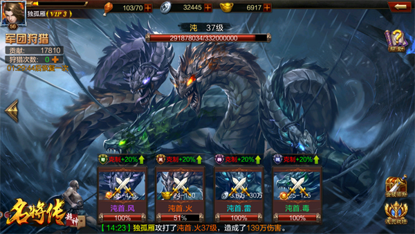 玩家还可以通过远征中的“猎杀boss”来获得元宝,凡是军团名望排名前三的军团成员,均可以获得大量元宝奖励。除此之外,参加军团的玩家也可以通过军团狩猎活动,挑战“沌首·火”,从它身上也能获取为数不少的元宝呢。