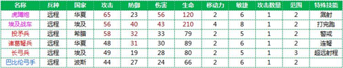 长弓兵:长弓兵有一个前期大家都喜欢的技能,超远射程(3格射程)。绝大部分的远攻兵种都只有两格射程,虎蹲炮通过溅射勉强能伤害到第三格的兄弟。而埃及的长弓兵拥有超远射程这个技能,在前期拥有巨大的优势(注意,是在前期)。让你能各种风骚射击,还让别的高攻高爆的货打不到你。对于贫民玩家是很不错的省钱利器。But后期吧……