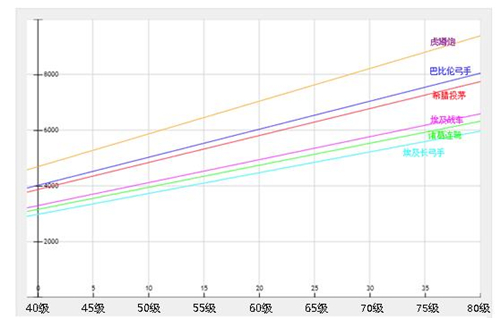 简单的说一下这张图怎么看,X轴为等级,Y轴为伤害总量(以防御方位60点防御为基础,无地形加成)的状态下,各远程兵种在40级(所有攻防都加完了,以后只加编队的状态下)造成的敌方伤害的函数图谱。一个蓝色兵种的巴比伦竟然如此扎眼,令我汗毛竖立双腿发软,蓝色兵种超越绝大部分紫色红色兵种,达到了这种伤害等级。同时敏捷为6,与小炮齐平。不用任何特殊技能,无视所有主城等级,默默完成了底层兵种的逆袭。黄天在上厚土为证,波斯唯一远程兵种并不输给任何人。谁说我波斯皮厚血多,那是前排。后排我们照样攻高敏强。