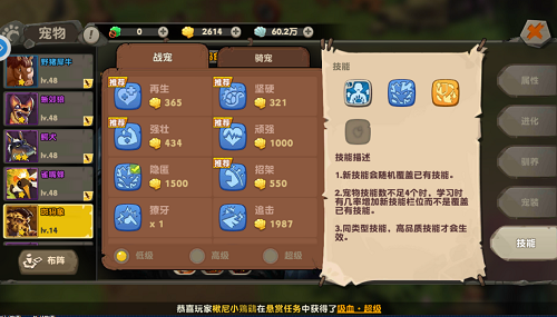 在战斗过程中还会随机获得宠物护甲、护符、项圈,给宠物穿上可以增加它的整体实力。在宠物技能那一栏,战宠和骑宠的技能学习也有所不同,技能学习可以自己花费金贝来进行,宠物等级上去了需要的战斗力更多了你就可以覆盖之前比较垃圾的技能了。