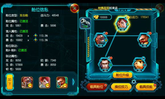 3,舱位升级。每提升一级需要一定数量的零件。4,操控技巧。每增加一次需要一个技巧证明,每个猎人都有对应的技巧精通,也就意味着要合理安排猎人与舱位,这样才能把战力提升到最大。舱位总共有5个分3种,2个攻击舱,2个防守舱,1个驾驶舱。