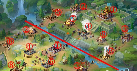 同一个守将可以分别列阵在两大块区域(以地图中的小河为界),一键布阵时,系统会根据营地的重要性将己方守将布置其中。地图中小编已经标注了自动布阵的优先级,数字①表示自动布阵的守将最为强大,由①到⑧,依次变弱。如果发现对手在河道前方区域的守卫实力排布如图中标注,对手是一键布阵的可能性就非常大了。此时河道后方的⑤⑥⑦⑧四个营地将会是非常空虚的,防守分布也将与河道前方类似,此时河道后方营地中暗格的守将实力就可以直接预估了,把握此点,将有利于对未知区域的防守分布进行判断。