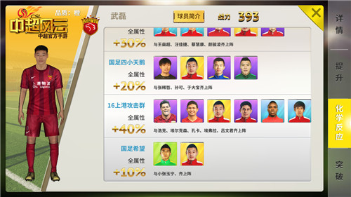 虽然《中超风云》手游拥有权威的球员数据,但比赛终归不是简单地数据堆砌,当球员与球员相遇时,总会有一些意想不到的激情碰撞,让球赛更精彩。为了将这种激情碰撞得到还原,《中超风云》手游特意设置了“化学反应”玩法。当某些特定球员相遇时,就能获得不同程度的属性加成。例如,当武磊与张玉宁同时上场时,将能出发“国足希望”,增加10%全属性。而当武磊、张稀哲、孙可、于大宝站到一起时,“国足四小天鹅”的化学属性就将被触发,全属性提升20%。