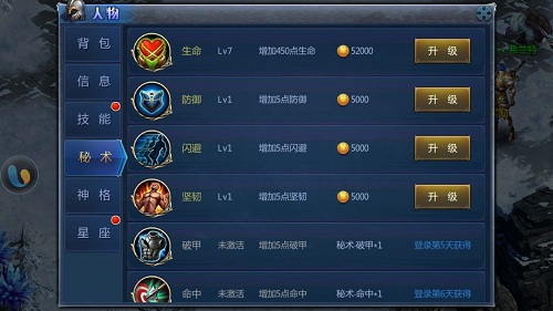 秘术系统主要由:生命、防御、闪避、见人、破甲、命中组成,具备相应的条件便可激活。每个秘术都可以升级,等级越高增加的相应属性也就越高。但是相对的,越到后面消耗的金钱越大。