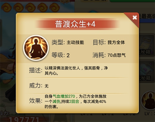 以精深佛法渡化世人,强其筋骨,净其内心。提升自身气血,主动释放时为己方全体释放一个“减伤”Buff,持续两回合,每次减免40%的伤害。