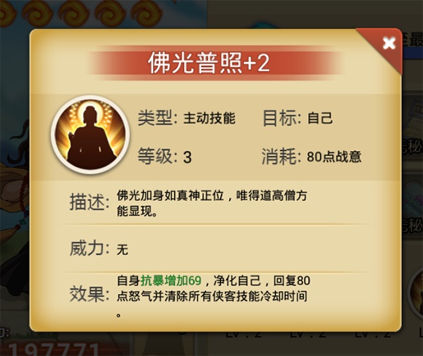 佛光加身如真神正位,可提高自身一定抗爆,净化自身,回复80点怒气并清除所有侠客技能冷却时间。