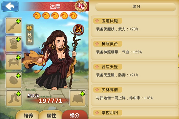 达摩祖师主动技能不但提供“减伤”Buff,还提升自身一定气血。立地成佛这个技能在增加自身武力的同时还增加气血和防御,并且是以百分比的形式增加。配缘属性中,达摩祖师拥有67%的气血、44%的防御,还有18%的命中和20%的武力的总加成。其配缘之后的属性绝对是非常强力的。