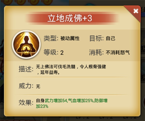 以无上佛法伐毛洗髓,强健根骨,延年益寿。被动效果提升自身一定武力,气血增加25%,防御增加23%。