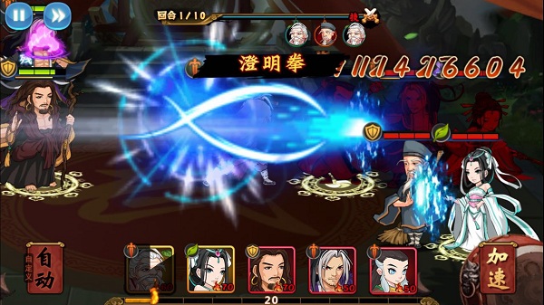 然后,微信菌要说,顽皮老人最变态的地方就在此——分心二用术。普攻回合有几率释放“澄明拳”。意味着顽皮老人不消耗怒气也可以释放主动技能。澄明拳的“低落”效果持续两回合,机会把握的好的话,可以让对方一排的侠客无限低落。