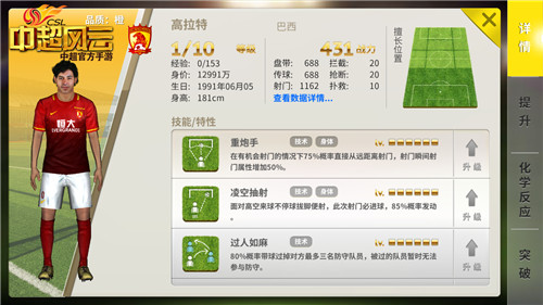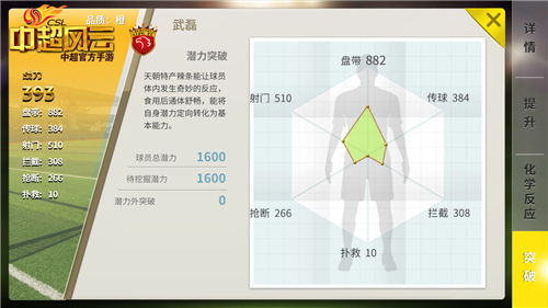 突破是《中超风云》手游中一个独特玩法,同时也是改造球员的重要玩法。在这里玩家可以通过给球员喂食天朝特产“辣条”,来提升6个基础属性中的任意一个,且是永久提升。所以,突破就成为提升球员射门属性的捷径。