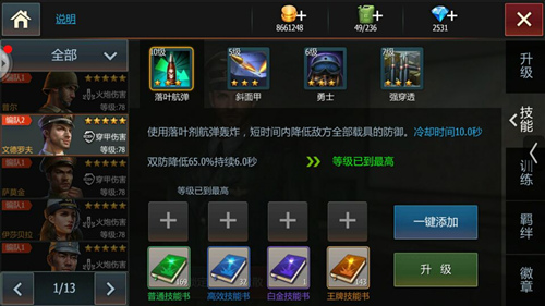 《钢铁雄狮》中,技能落叶导航释放之后首选推荐同CD技能“萨莫金”的“战场咆哮”,同为buff技能的“战场咆哮”满级能提高40%最终伤害且持续5秒,还有“魏特曼”11秒CD主动技“急速射击”提高全部载具射速50%且持续6秒。此三个buff叠加使用,能让全体坦克在开展后的第10秒至16秒打出一波超级爆发,瞬间完成战场逆转。