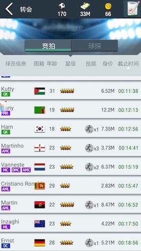 在狩猎潜力巨星的时候,需要把握三个重点:一是球员的三围,二是球员的技能,三是球员的年龄。“三围”里包含了进攻能力,防御能力,和身体素质,是观察一个球员是否能成为巨星的最直接的数据!“技能”则是一个好球员不可或缺的关键能力,就如同小罗的盘带,大空翼的曲线射门,可以让球员在比赛上大放异彩!“年龄”这个数据对一个球员未来的发展来说,也是极为重要。因为球员年龄越低,离退休年龄就越远,可训练空间就越大,这和现实球坛一样,越年轻越值钱,18岁花季少年在游戏的转会竞拍里是最抢手的球员!但是没关系,只要事先准备好充足的金币,看准狩猎目标,不管竞争多少轮都要一口气拿下!那么恭喜你,终于获得了巨星级潜力球员,可以开始下一步计划了!