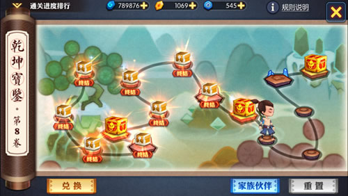 乾坤宝鉴每一卷共有12个关卡,每通过一个关卡都将获得相应奖励。而每4关为一个节点,通过这个节点将有宝箱可开启获得额外奖励。前8关,通关剩余时间将转化为积分累积,累积满后将无需再挑战即可直接领取该关卡的奖励。