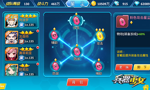 宇宙中拥有无穷的奥秘,传说在银河系的十二宫拥有神秘星尘力量,星尘散落大地人类基因融合,兵器少女诞生!在《兵器少女》全新GVE挑战玩法中,将引入十二宫星座概念,小伙伴们可以依次挑战十二宫,获得神秘星尘!
