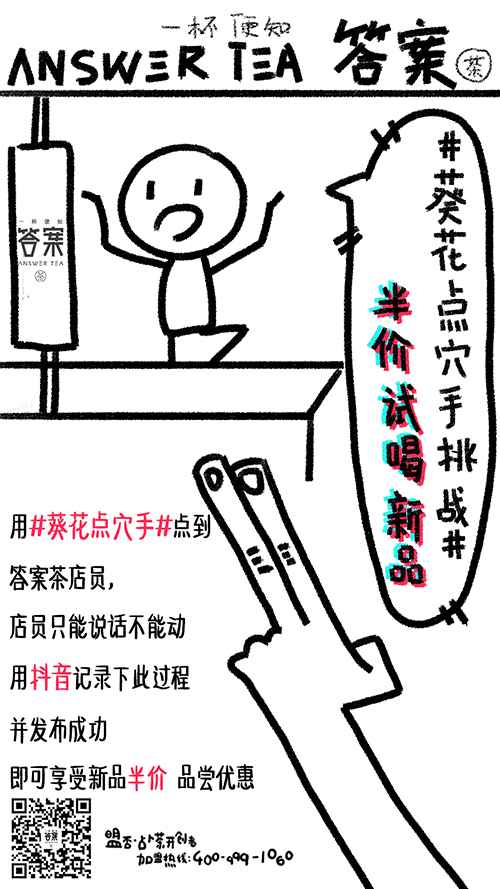7月5日-7月7日期间,亲自到答案茶(盟否)门店,在#葵花点穴手#活动中,向店员使出白展堂的看家本领“葵花点穴手”,成功戳中则使其不能行动。用抖音记录这一过程并发布成功,就可以打开新品隐藏菜单,获得“衣兮青梅乌龙”和其他产品。体验游戏乐趣的同时,还可以享受新品优惠,快来施展你的绝世武功吧!