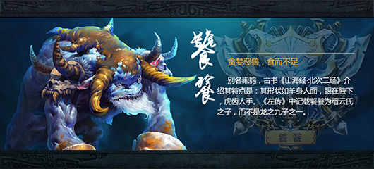 饕餮:传说轩辕黄帝大战蚩尤,蚩尤被斩,其首落地化为饕餮。《山海经·北山经》有云:“钩吾之山其上多玉,其下多铜。有兽焉,其状如羊身人面,其目在腋下,虎齿人爪,其音如婴儿,名曰狍鸮,是食人。”狍鸮即饕餮。作为上古四大凶兽之一,饕餮每次出世都会携带各种稀世珍品,勇士们可以在世界首领活动中讨伐饕餮,夺取稀世珍品。