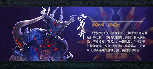 穷奇:喜食人。《山海经·海内北经》记载:“穷奇状如虎,有翼,食人从头始,所食被发,在犬北。一日从足。”称穷奇是一种生活在西北,长得像虎有翅膀,喜欢吃人的怪物。它能听懂人说话,听到人争吵就去吃有理的一方,听说有人忠诚有信义就去咬人的鼻子,但听说有人凶恶不讲道理反而会赠送自己咬死的动物。这样“是非分明”且付诸行动的怪兽较为少见。同样勇士们也可以在首领活动中寻找到穷奇的踪迹,击败它可以得到丰厚的奖励。