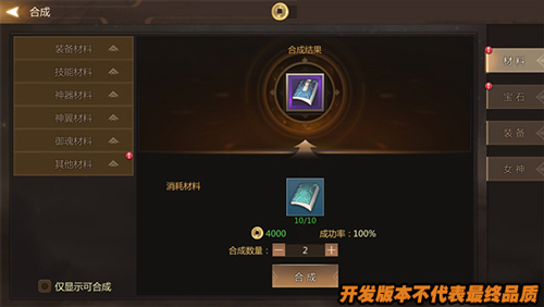打开合成界面我们可以看到,右边有四个选项,分别是材料,宝石,装备和女神。我们选择材料,可以看到在材料选项左侧会有6个子选项。对应部分系统材料的合成,选择你想要的材料可以看到需要的材料数量和合成条件。下面小编来着重介绍一下装备合成和仙灵合成系统。