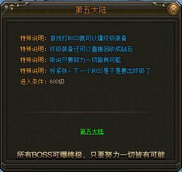所有BOSS可爆终极,只要努力一切皆有可能,《灭神》全新版本600级地图“第五大陆”正式来临。第五大陆的传奇等着你来缔造,更强力的BOSS就在这里邀你挑战!更高等级的装备,将会帮助你在战斗中无往不利!五品极品武魂将成为《灭神》第五大陆英雄的战利品!