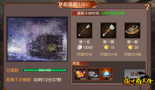 当然,借箭也并非零难度,各位英雄每次借箭之后,都会有冷却时间,每只箭增加2分钟。不过,在冷却时间累积超过30分钟后,玩家可以消耗元宝将冷却时间消除,这样就能加速完成目标了。值得注意的是,每次借箭成功,都会有对应的固定奖励可领取呢!